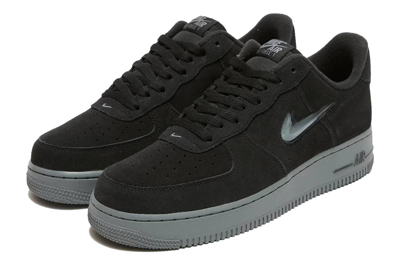 Nowa odsłona „Cool Grey” wyróżnia się gładkim, szarym zamszem, który pokrywa całą cholewkę – od palców po piętę. Czarny, połyskujący Swoosh Jewel kontrastuje z subtelną bazą, dodając butom charakteru. Na pięcie znajdziemy wytłoczone logo „Nike Air”, które podkreśla wyjątkowość modelu.
