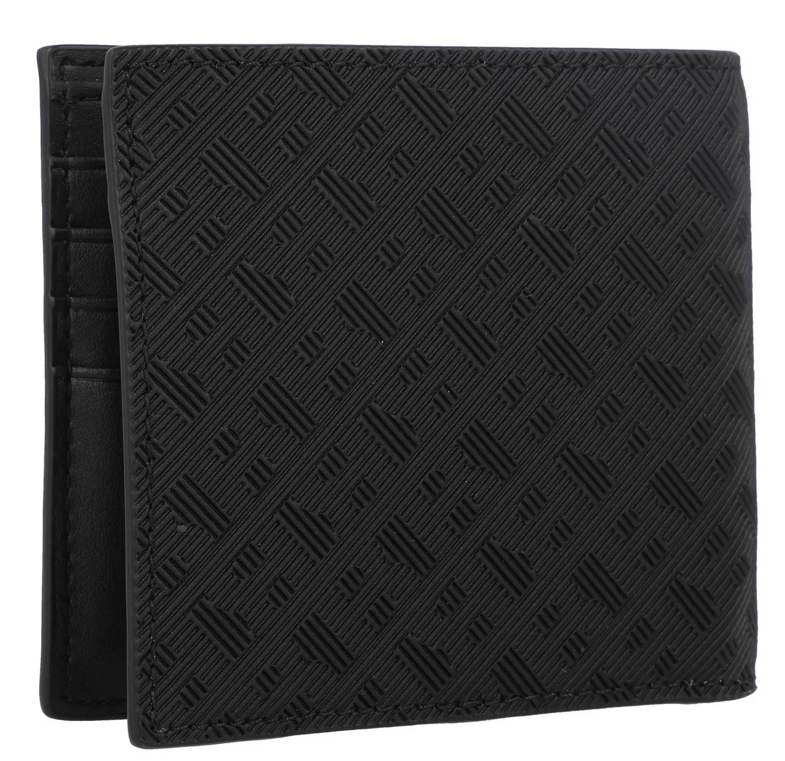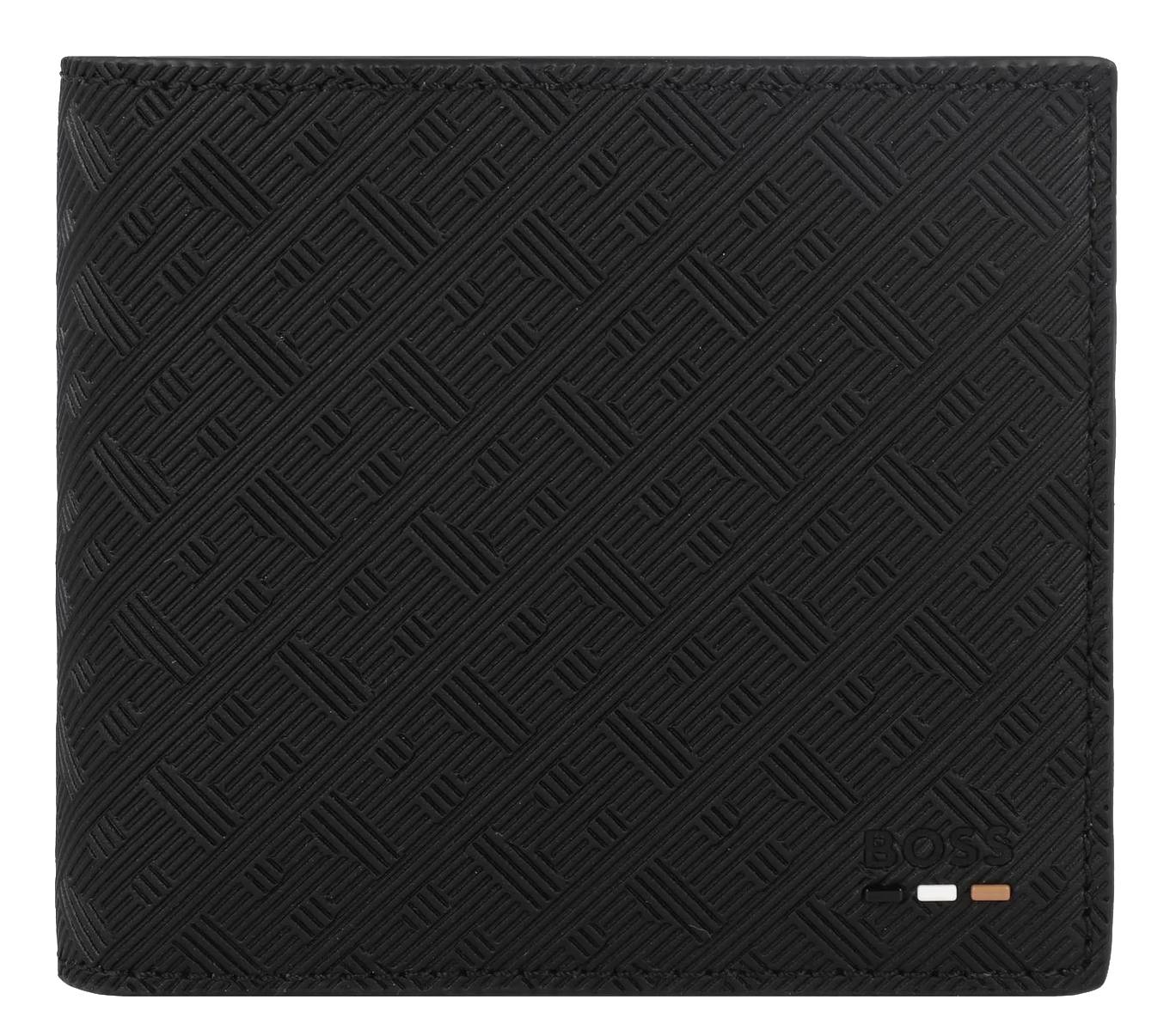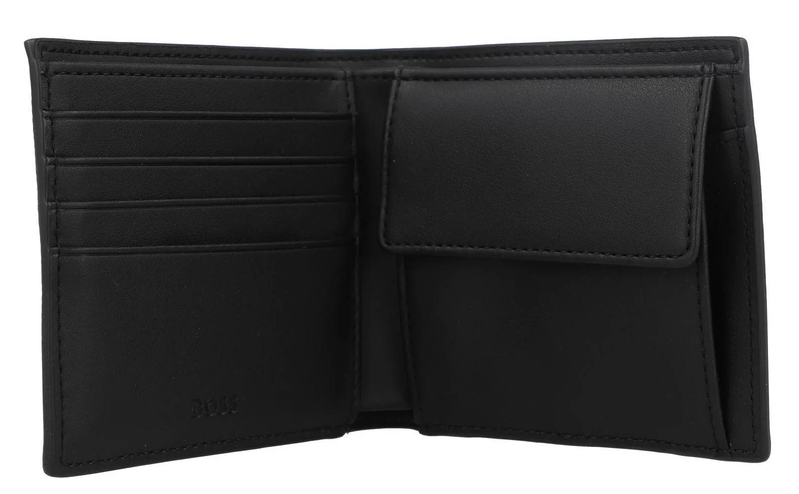Klasyczny portfel męski wykonany ze skóry ekologicznej marki Hugo Boss w kolorze czarnym. Praktyczne przegrowy na karty i banknoty. Model posiada kieszonkę na monety zapinaną na zatrzask. Na froncie wypukłe logo w postaci napisu BOSS.